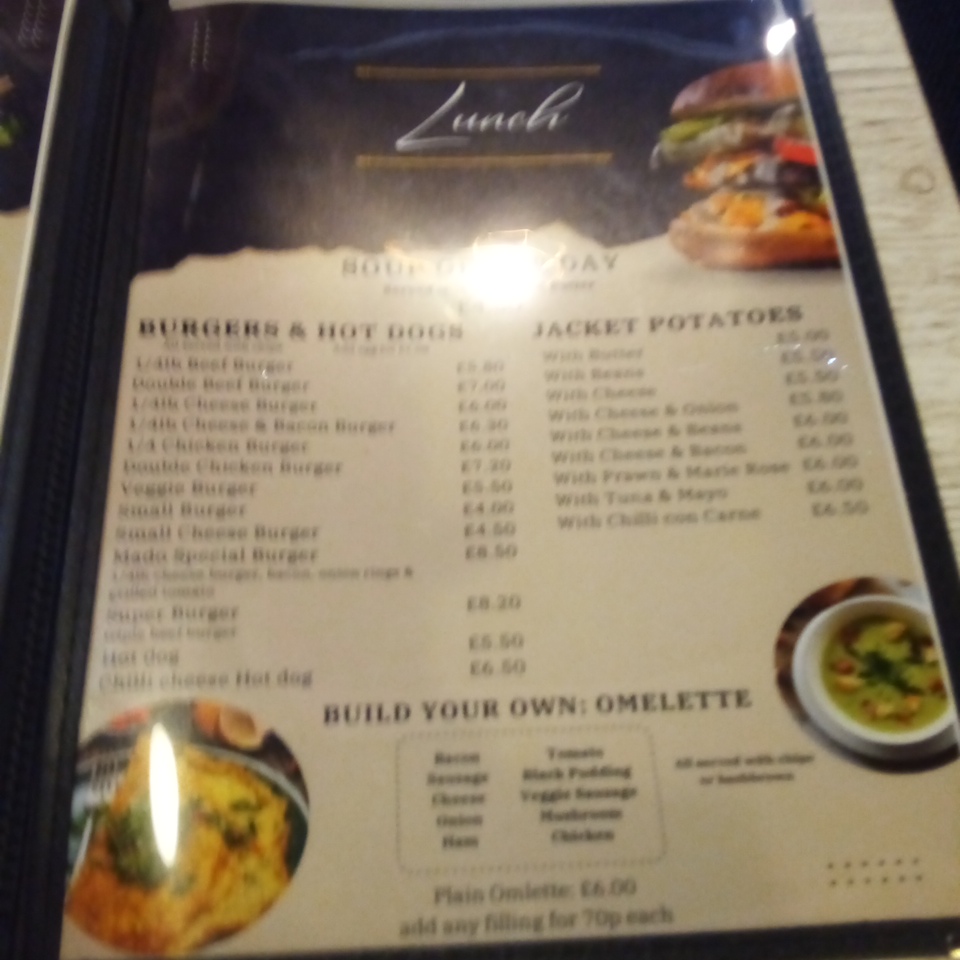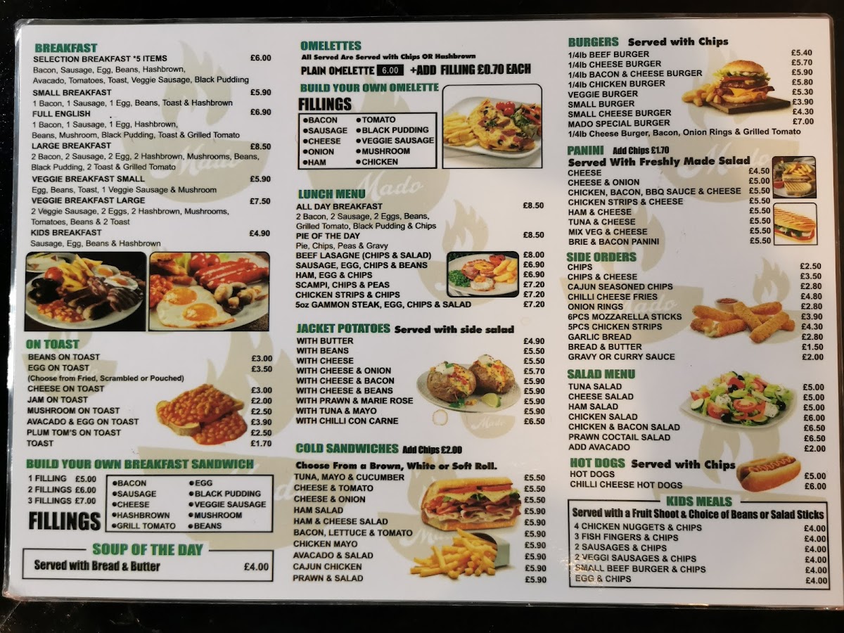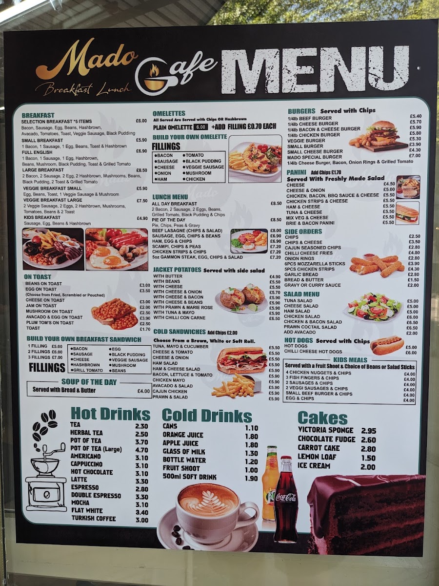 Overall, the menu at Mado Cafe offers a satisfying and approachable selection that caters to a wide range of tastes, from hearty breakfasts to comforting lunches and simple desserts. Classic options like Full English Small Breakfast, Eggs On Toast, and Mushrooms On Toast provide a solid start to the day, while lunch features such as Beef Lasagne, Pie Of The Day, and Ham, Egg And Chips deliver familiar, home-style flavors. The variety continues with lighter choices like Tuna Salad, Chicken Salad, and Prawn Cocktail Salad, alongside convenient bites such as Brie And Bacon Panini and Chicken Strips And Cheese Panini. For something more customizable, the Plain Omelette and build-your-own breakfast sandwiches with 1 Filling, 2 Filling, or 3 Filling add flexibility. The menu also caters well to younger diners with options like Fish Fingers And Chips and Sausages And Chips. To round things off, sweet treats like Carrot Cake, Chocolate Fudge, and Scone pair nicely with drinks such as Flat White, Mocha, or a refreshing 330ml Pepsi Can. Altogether, the menu strikes a balance between variety, comfort, and simplicity, making it a dependable choice for casual dining.